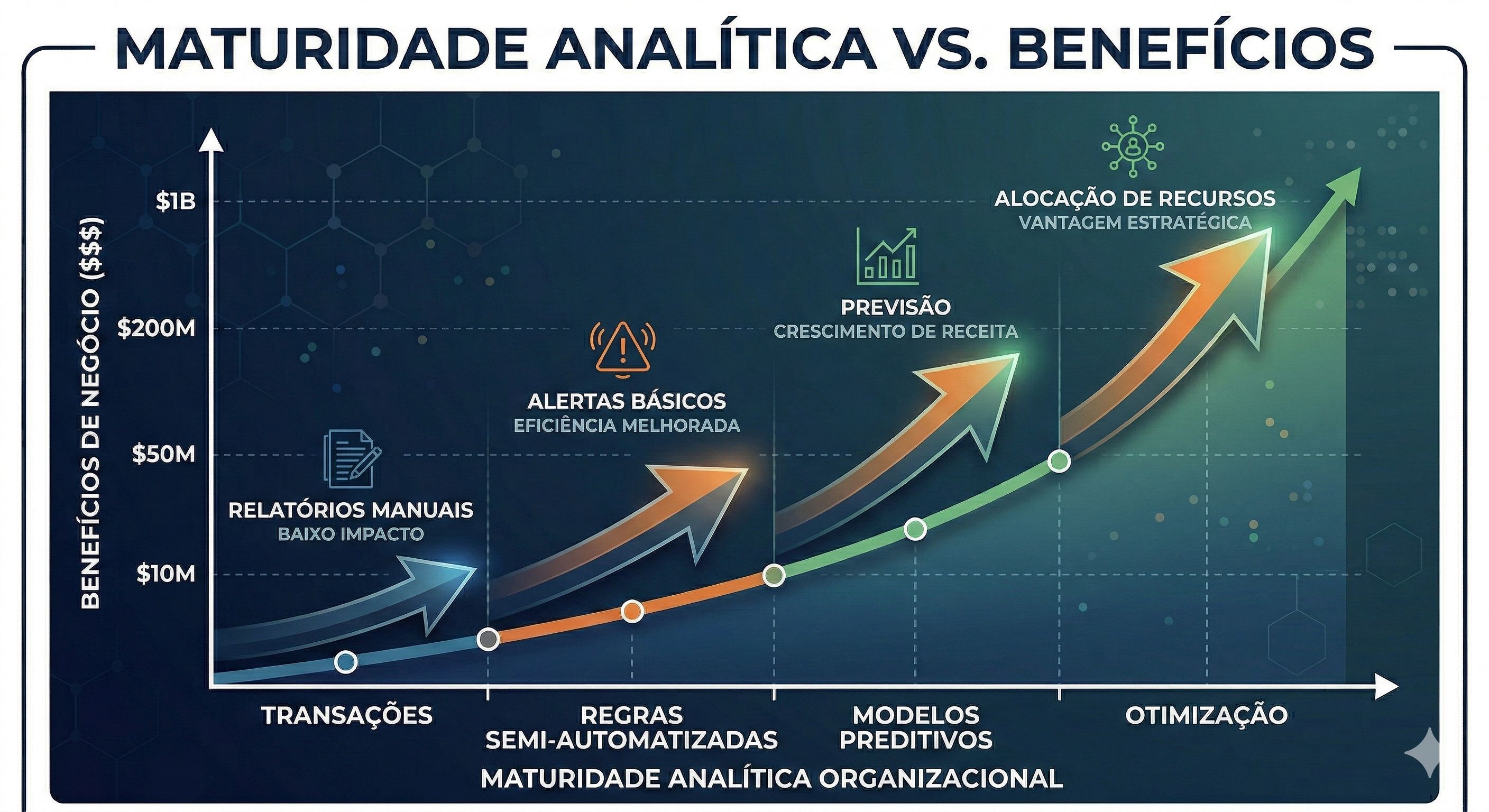 Na Figura 1 abaixo, Maturidade Analítica x Benefícios, ilustramos a evolução em termos de processos e modelos. Assumi-se que os quatro (4) pilares discutidos acima são parte da Cultura organizacional e também como parte da estratégia e metas/métricas dos executivos. Caso contrário, o fluxo de evolução terá gaps e gargalos e não seguirá de forma contínua como ilustrado.