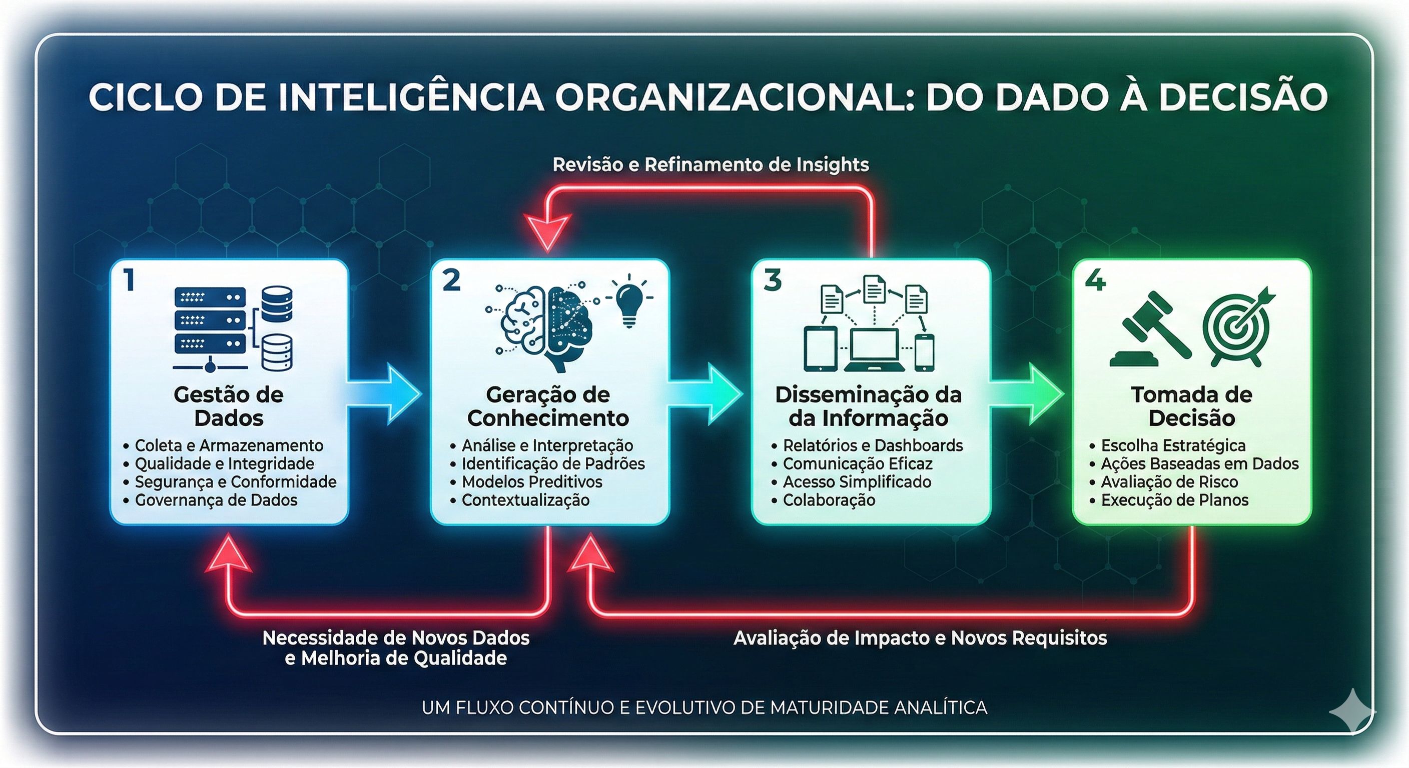 Em uma análise objetiva, a maturidade analítica é o que separa o “Conseguimos fazer” ("ruído") do “Entregamos segurança e conhecimento direcionado”("insight"). Não é um estado estático, mas uma estrutura que funciona continuamente, atemporal, i.e. ano após ano.Maturidade é evolutiva e uma função direta de quatro (4) pilares críticos: